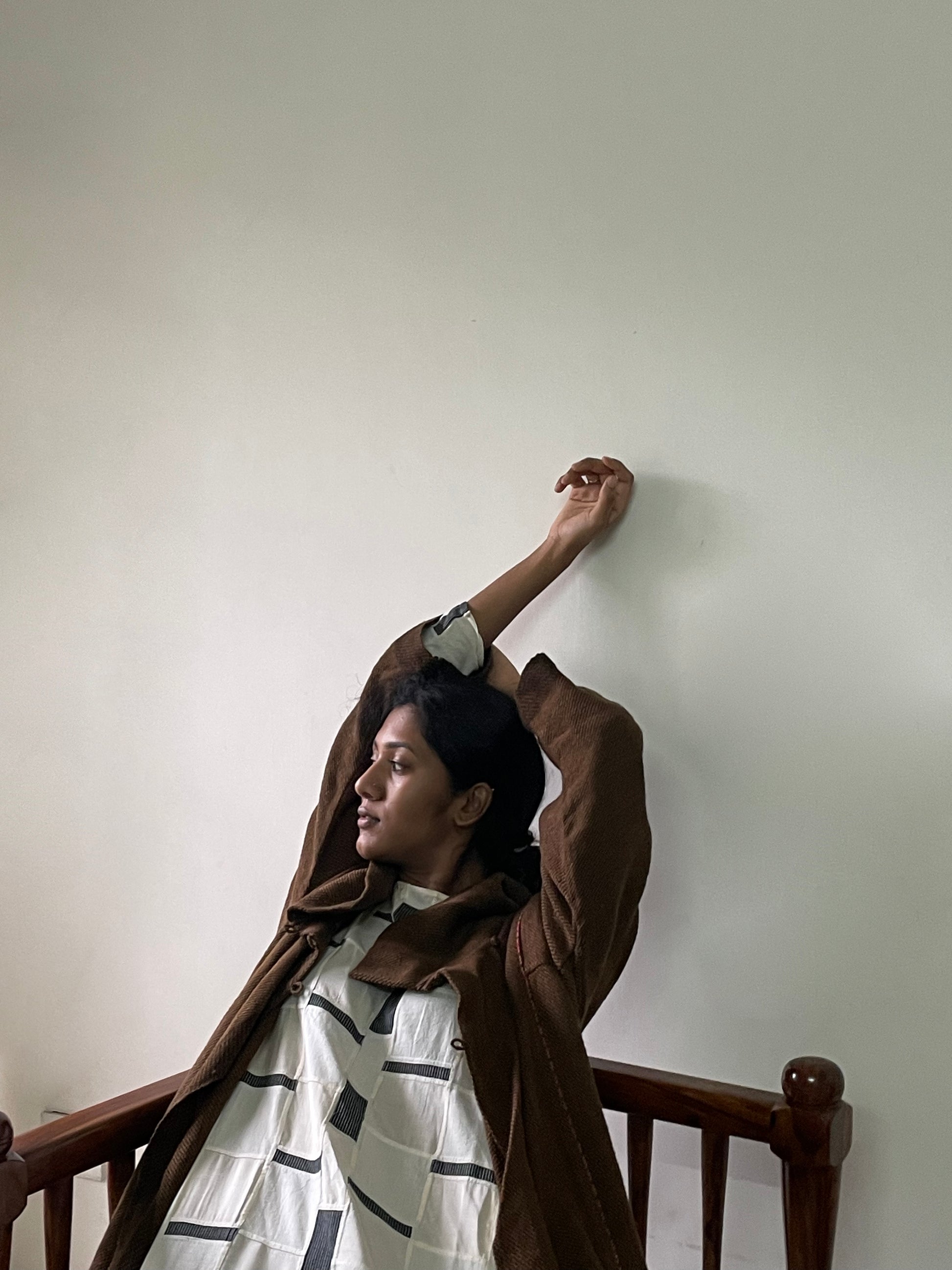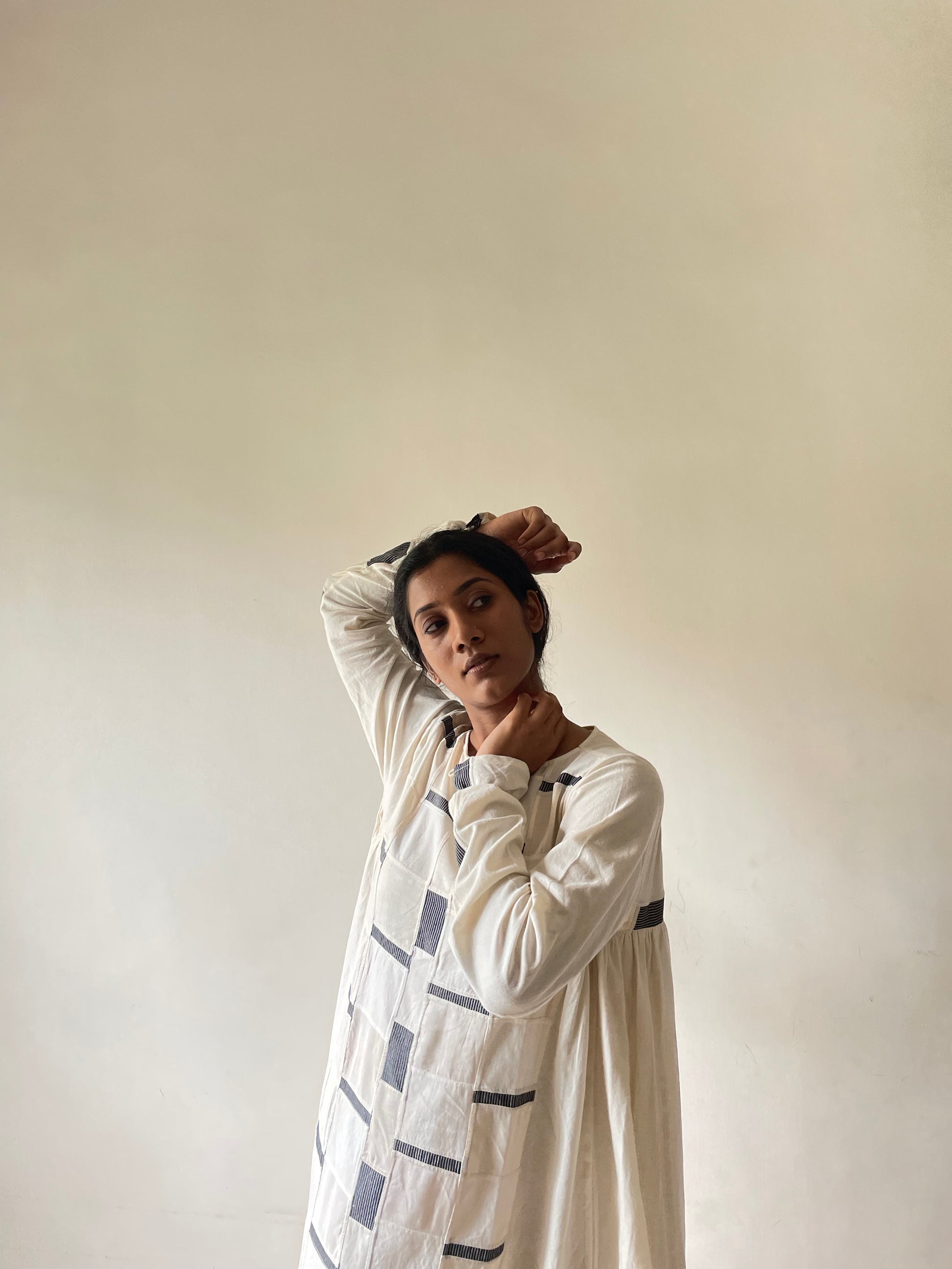 Front patched panel with a horizontal stripe running at the back to the hands. This dress is everything elegant as well as sophisticated. It makes up for a nice Kurta when paired with shalwar underneath. With slits on both sides and pockets to accommodate, the dress is modern-day Boheme.