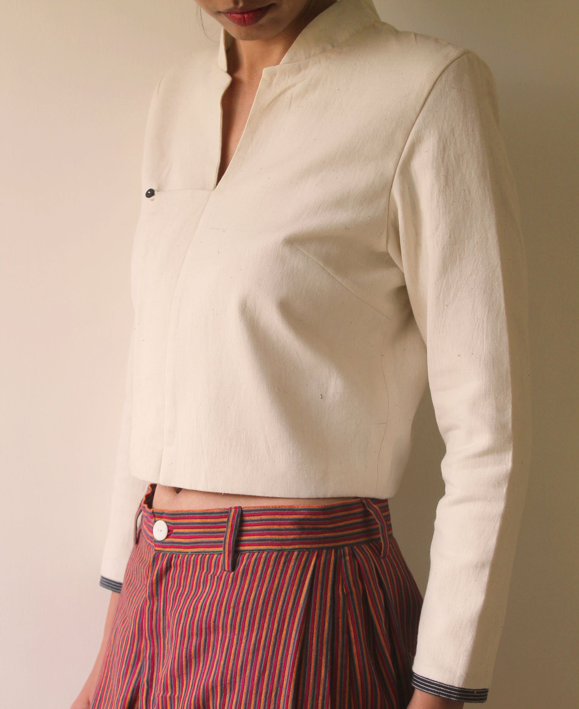 With bomber neckline, sleeve - hem detail and front covered placket. The blouse is a synonym to strong- feminine.this one is an easy pick for wardrobes blurring age and occasions.