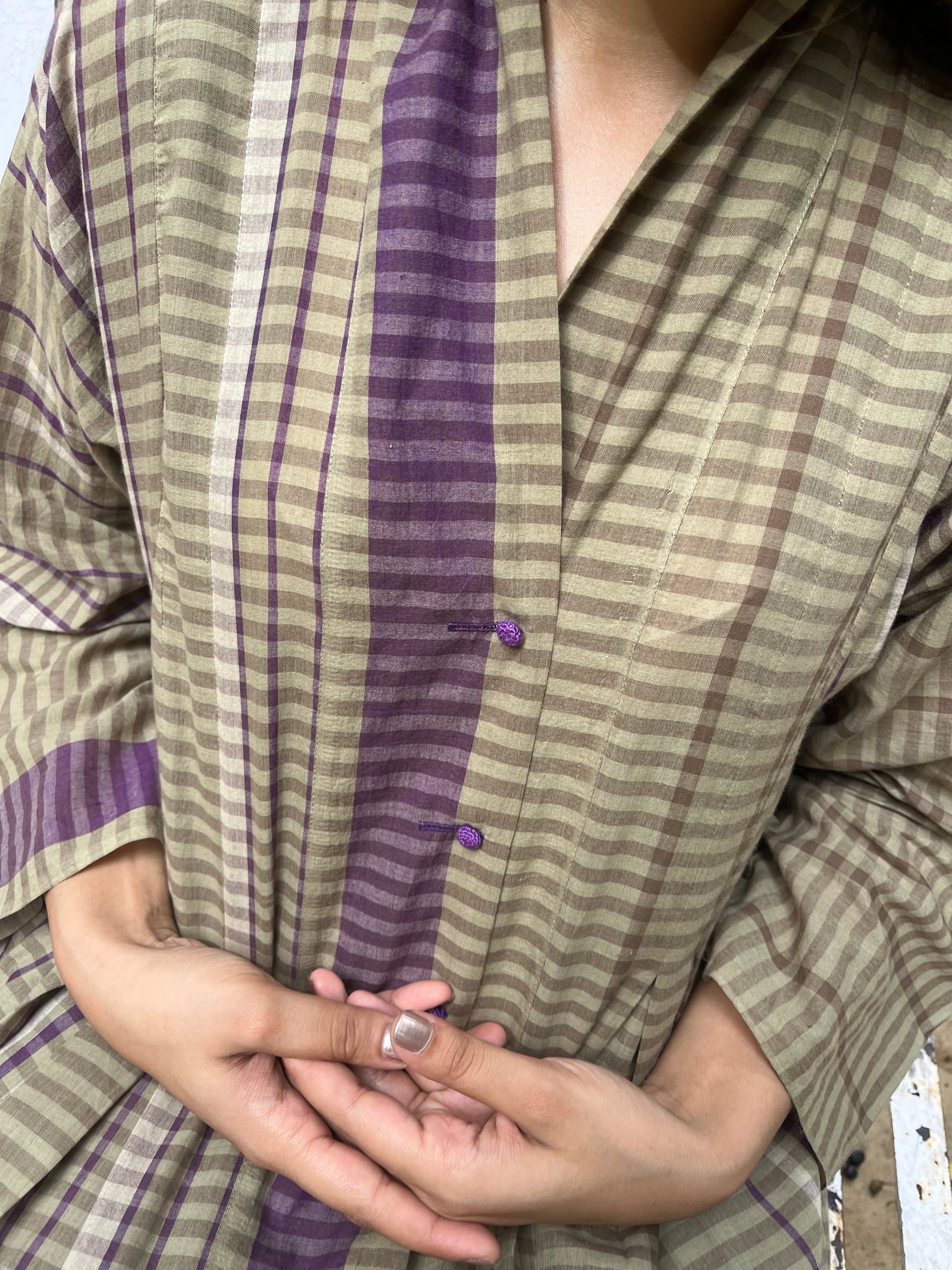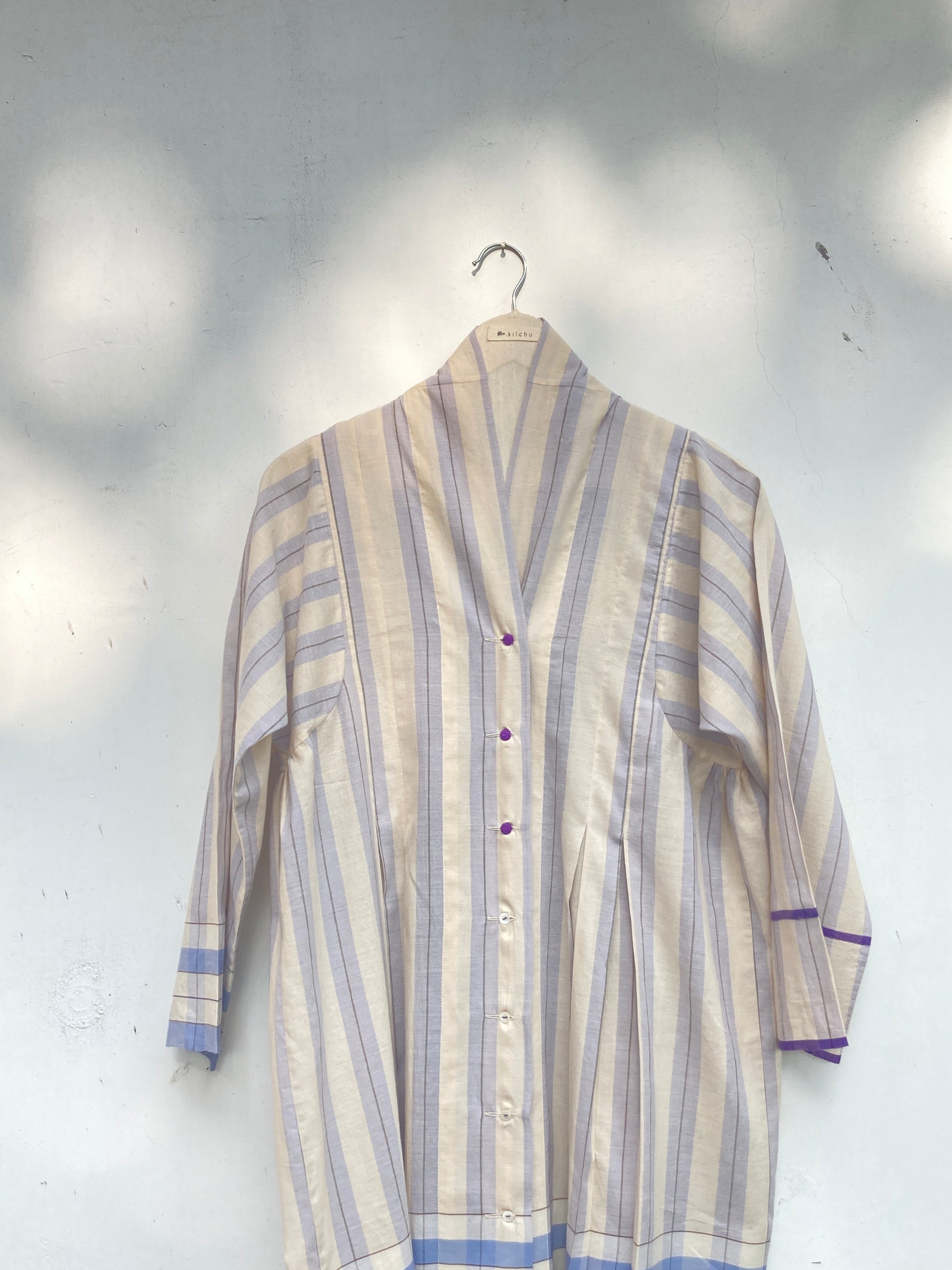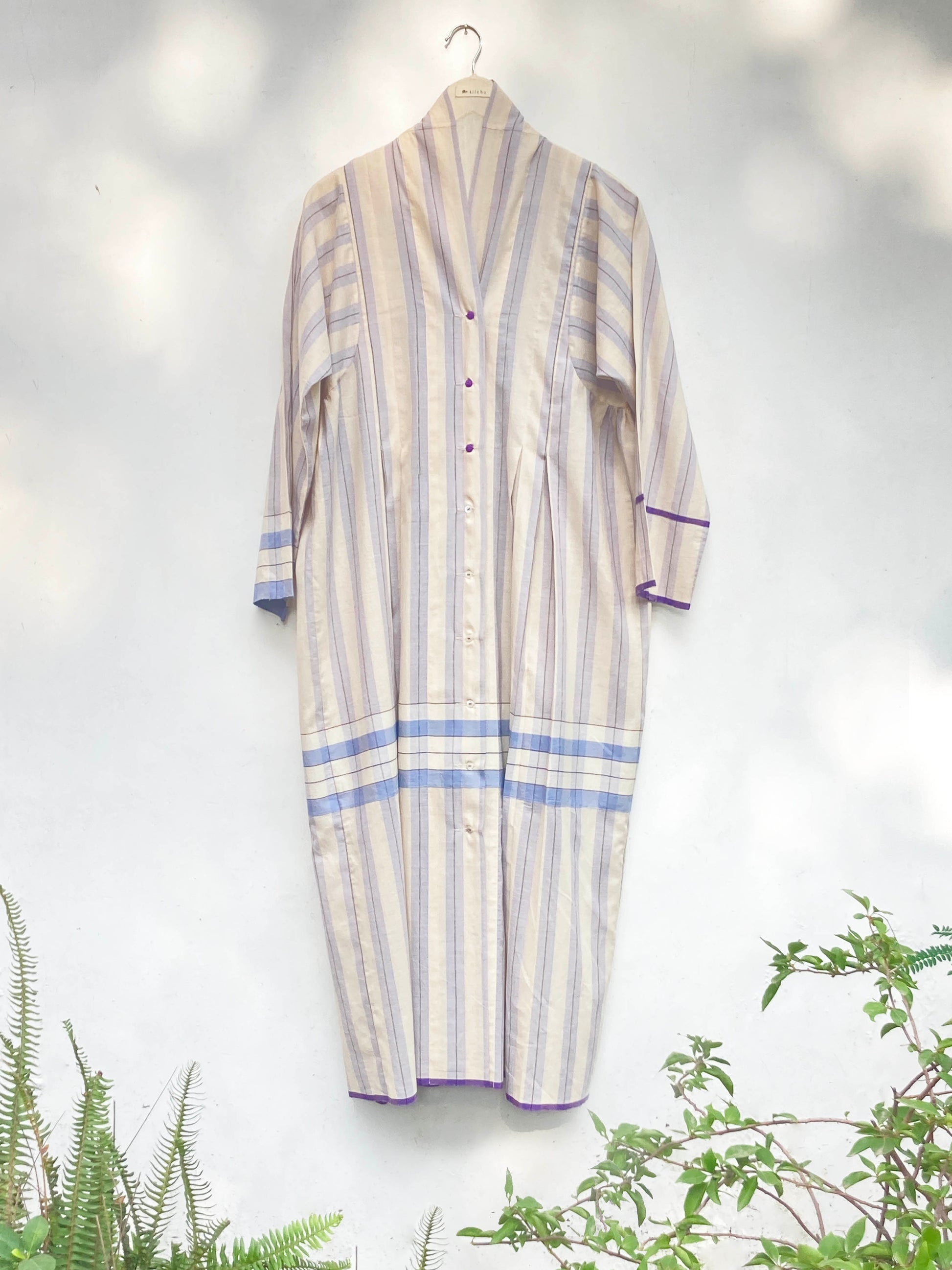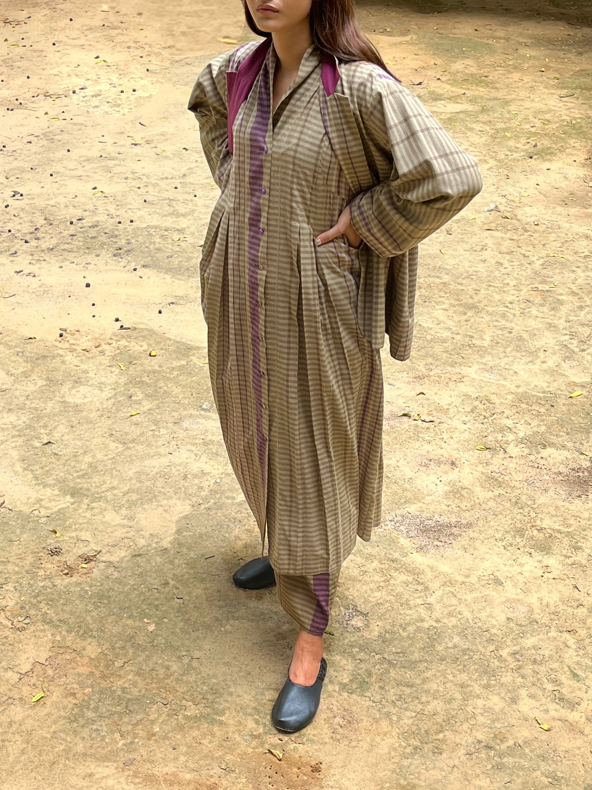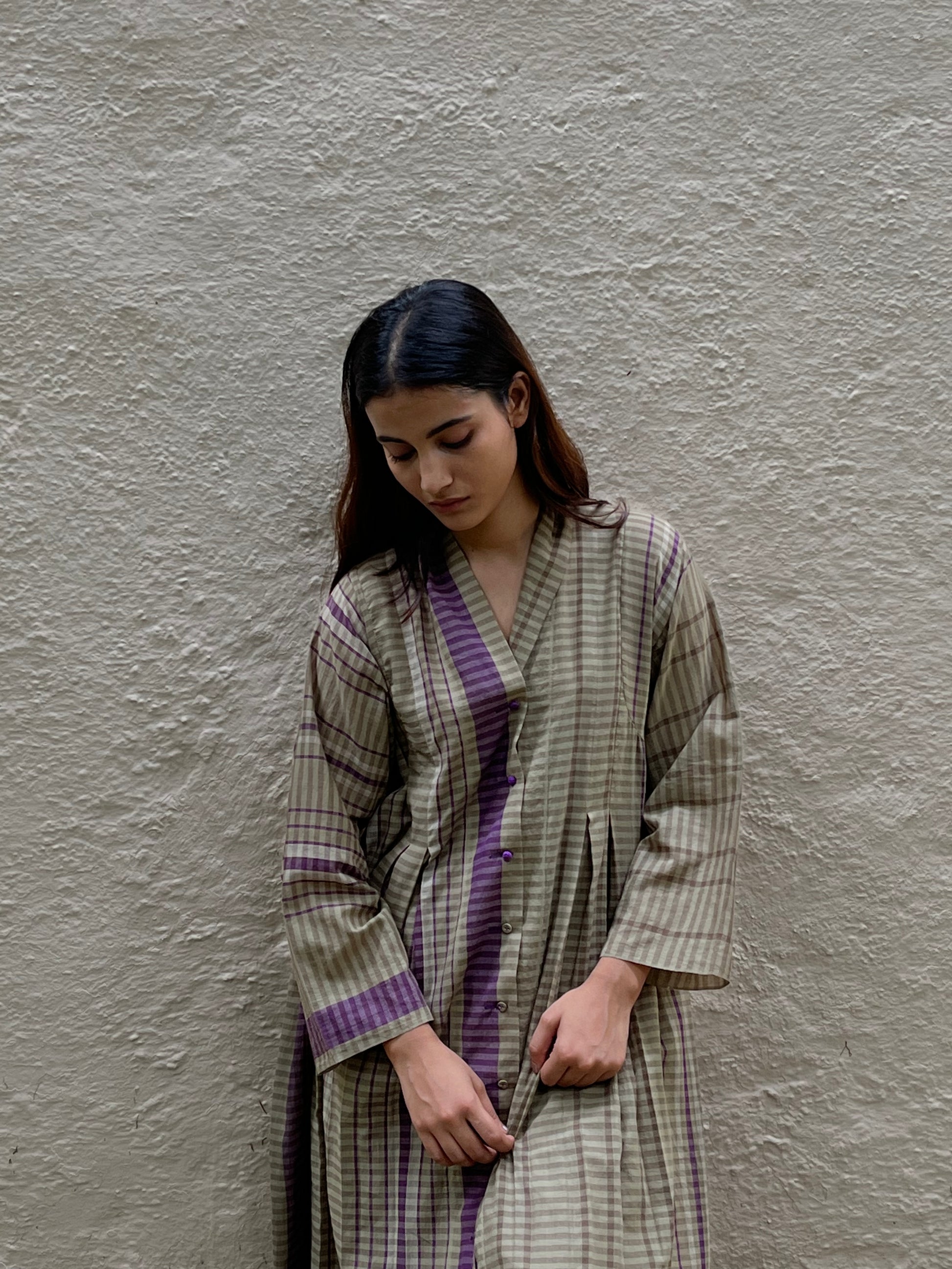 Front buttoned dress with front and back pleated panels. Wear it as a layer or as a dress. Find statement in effortless ease.