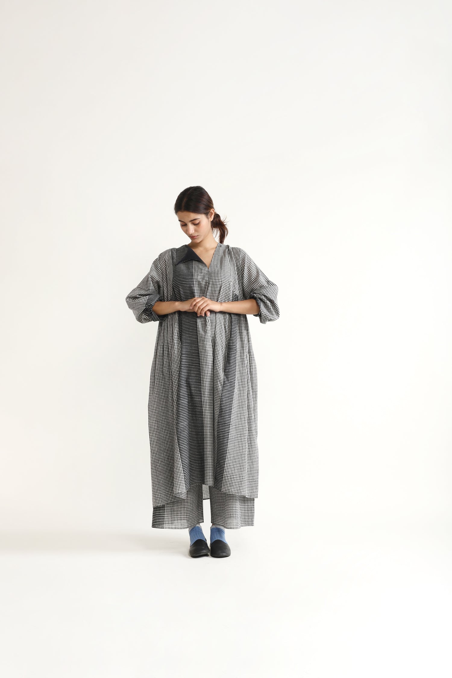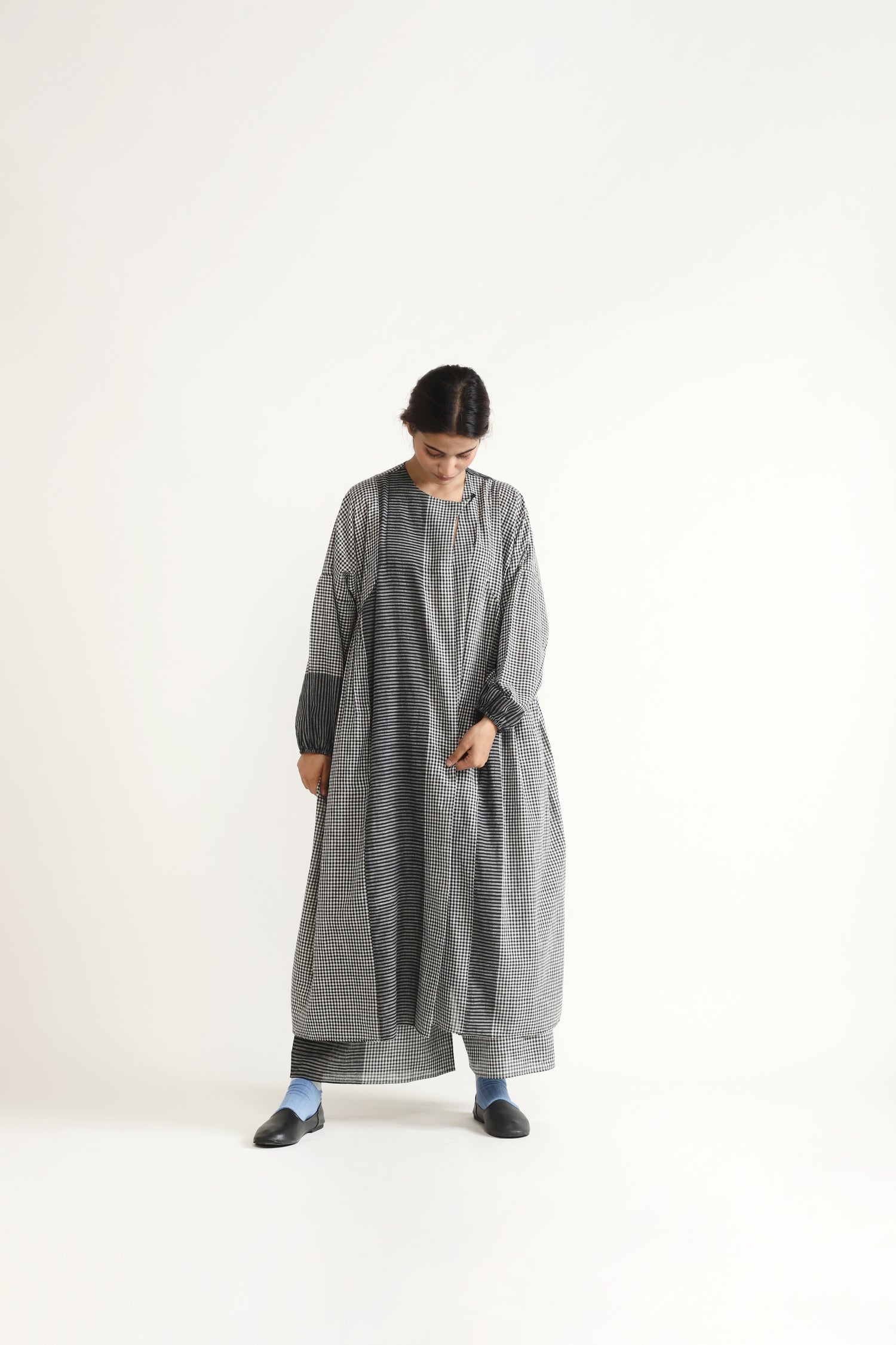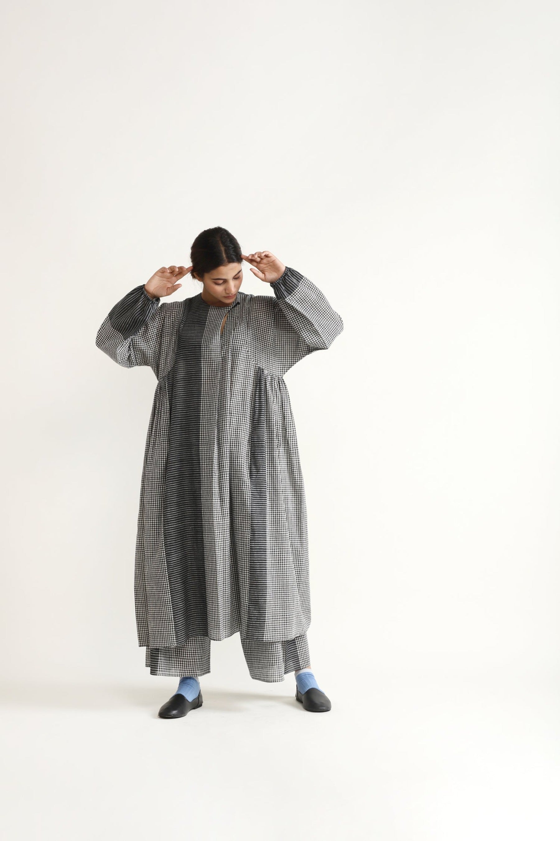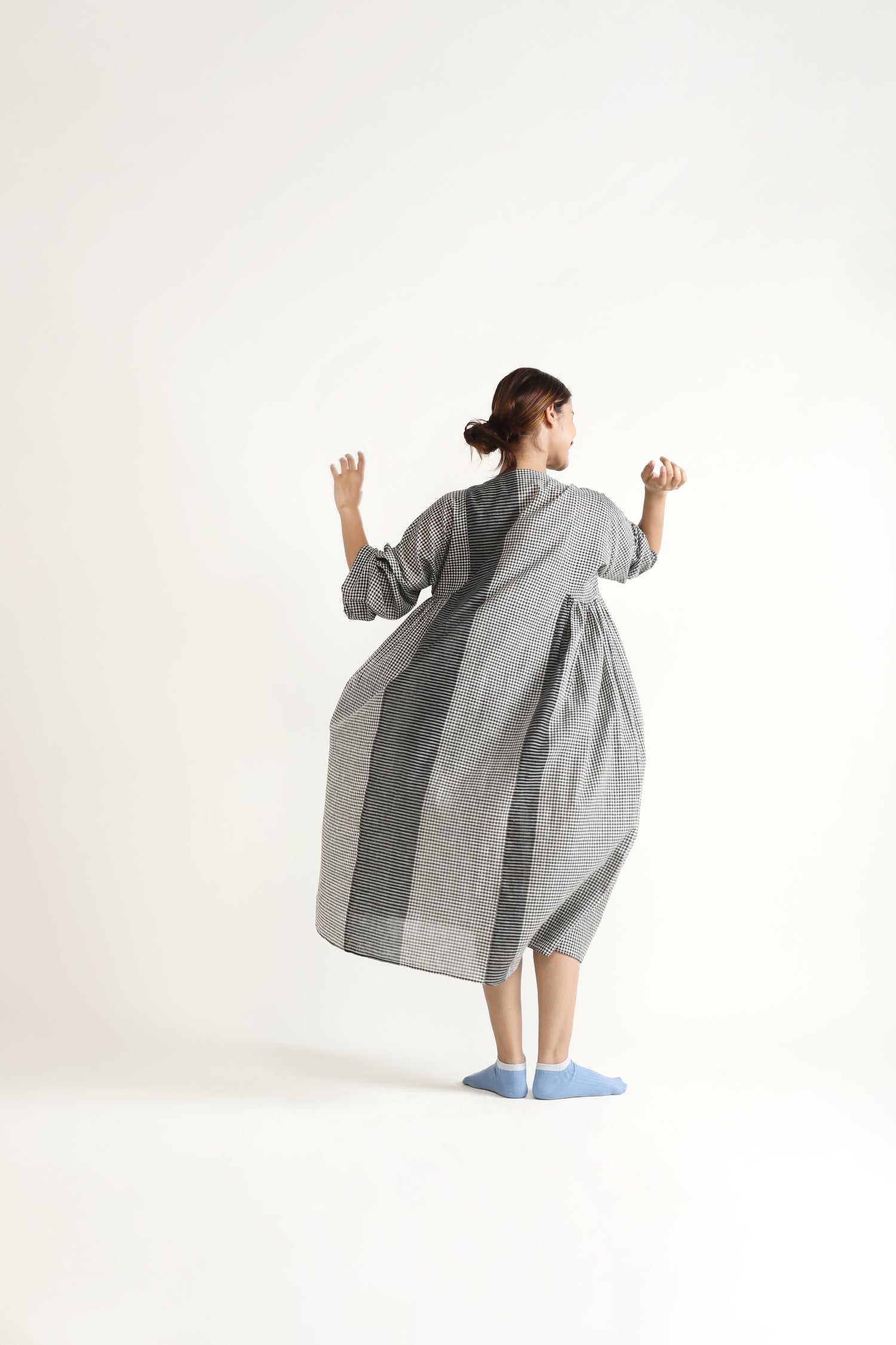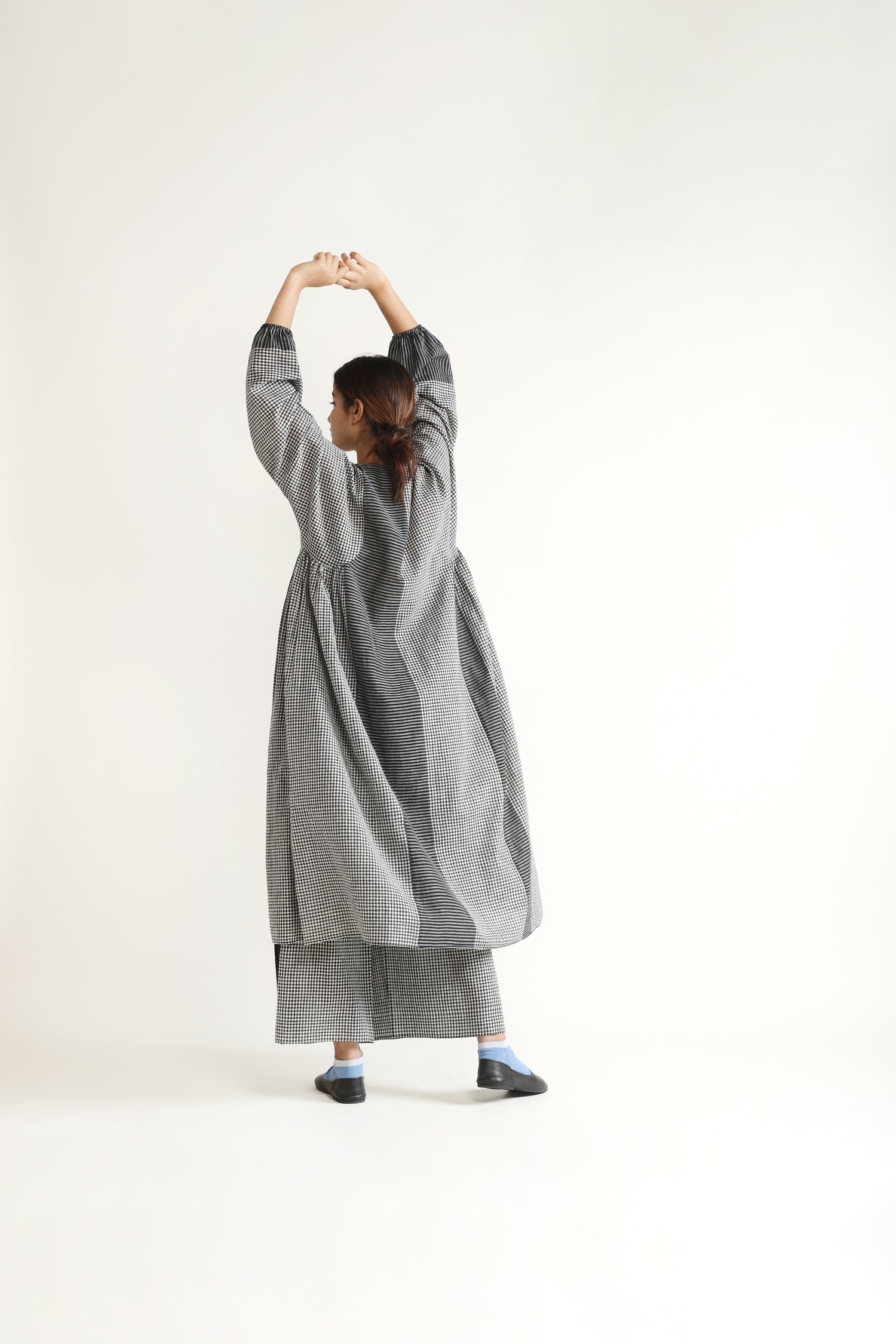 A Gingham dress for day work or playful evening routines. Made in handwoven cotton fabric The dress/ kurta sports a detailed neck and elasticated sleeves. has pocket on one side.