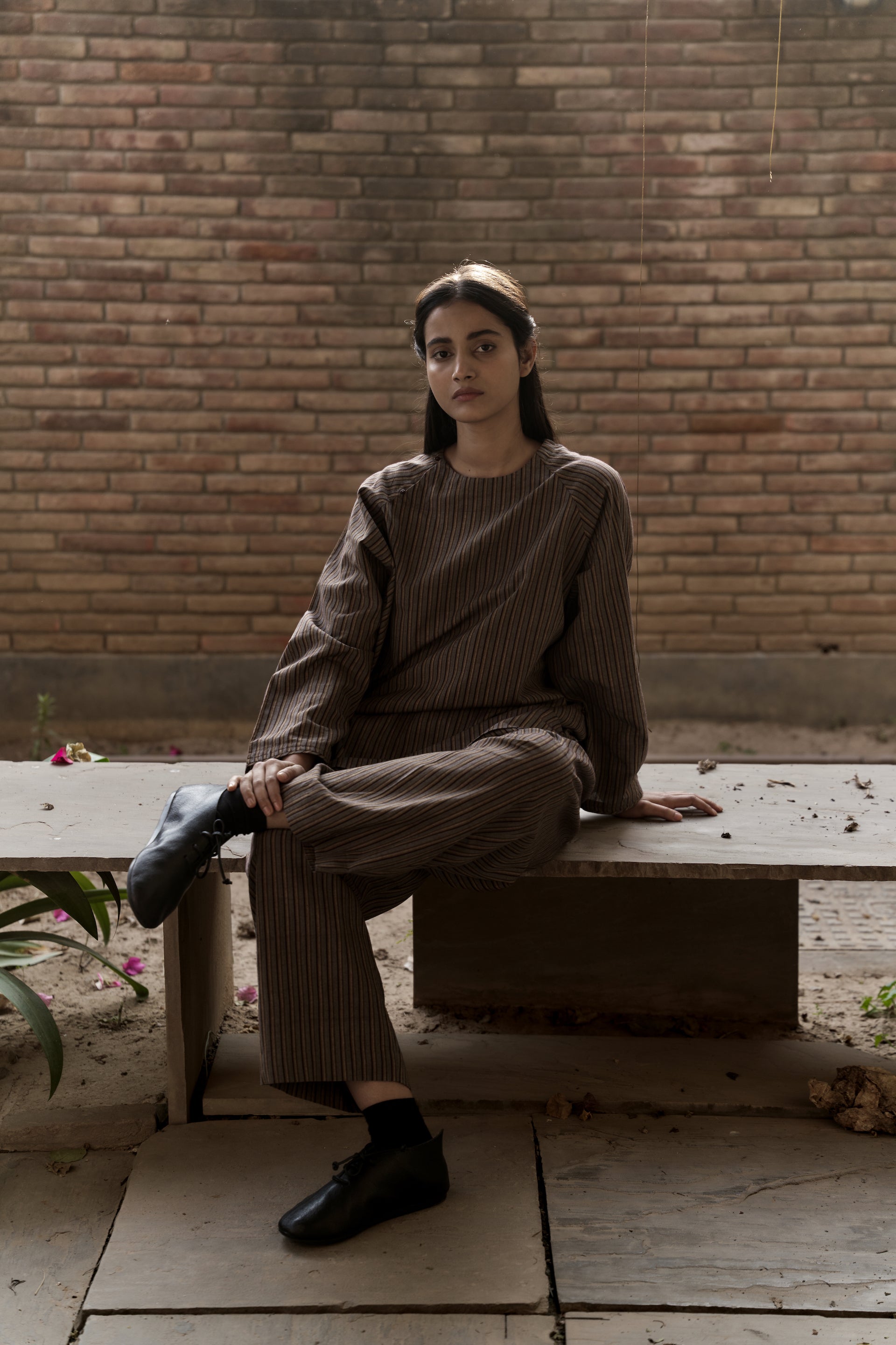 A well-tailored shirt stitched in handloom cotton. The yarn is tightly woven, giving the fabric its structure and crispness. Paired here with Pleated pants with an elasticated back in the same fabric.
